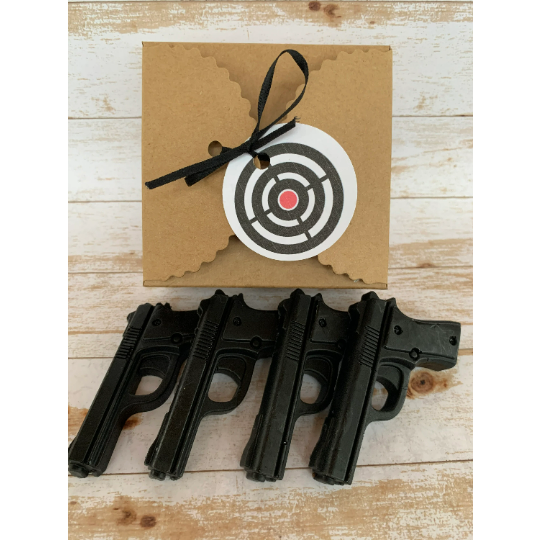 The must have soap for every gun enthusiast! This set of four soap guns are made out of glycerin soap and are colored in a shade of black. You can choose any scent below in the drop down menu. The soaps are then packaged in a cello bag with a ribbon and an attached target tag. These guns are then shipped off in their own brown scalloped kraft box with the target practice label attached to give it the extra excitement of what is in the box! The perfect Christmas gift or stocking stuffer, no wrapping and ready to go!